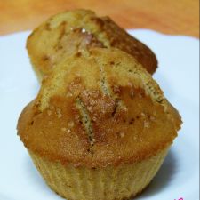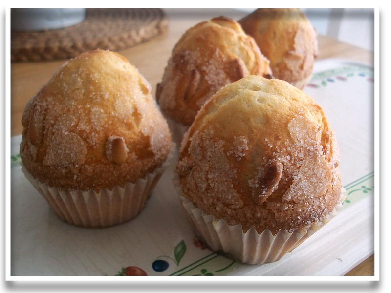 Rellenamos los recipientes de papel justo antes de hornear. Yo los llené casi al límite, más de 3/4 partes del recipiente. Echamos unos piñones y azúcar por encima. Las metemos en el horno que bajaremos a 210º-220º en cuanto hayamos introducido las magdalenas. Estarán hechas en 14 a 16 minutos. Cuando están doradas es cuando están hechas.