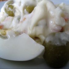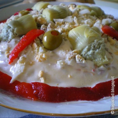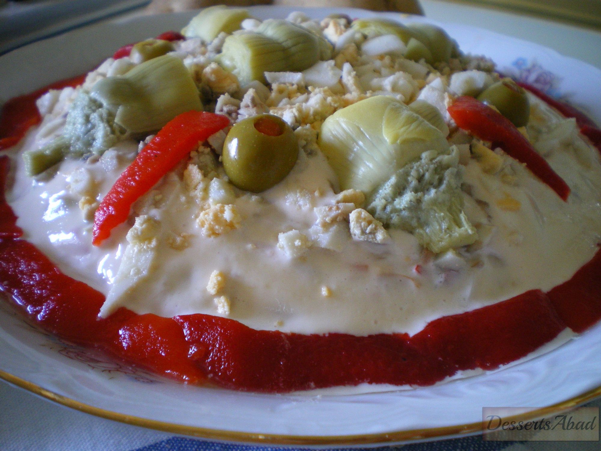 Apartamos al recipiente donde vayamos a servir, damos forma y cubrimos con más mahonesa toda la mezcla. Decoramos y llevamos al frigorífico antes de consumir un mínimo de 3 horas.