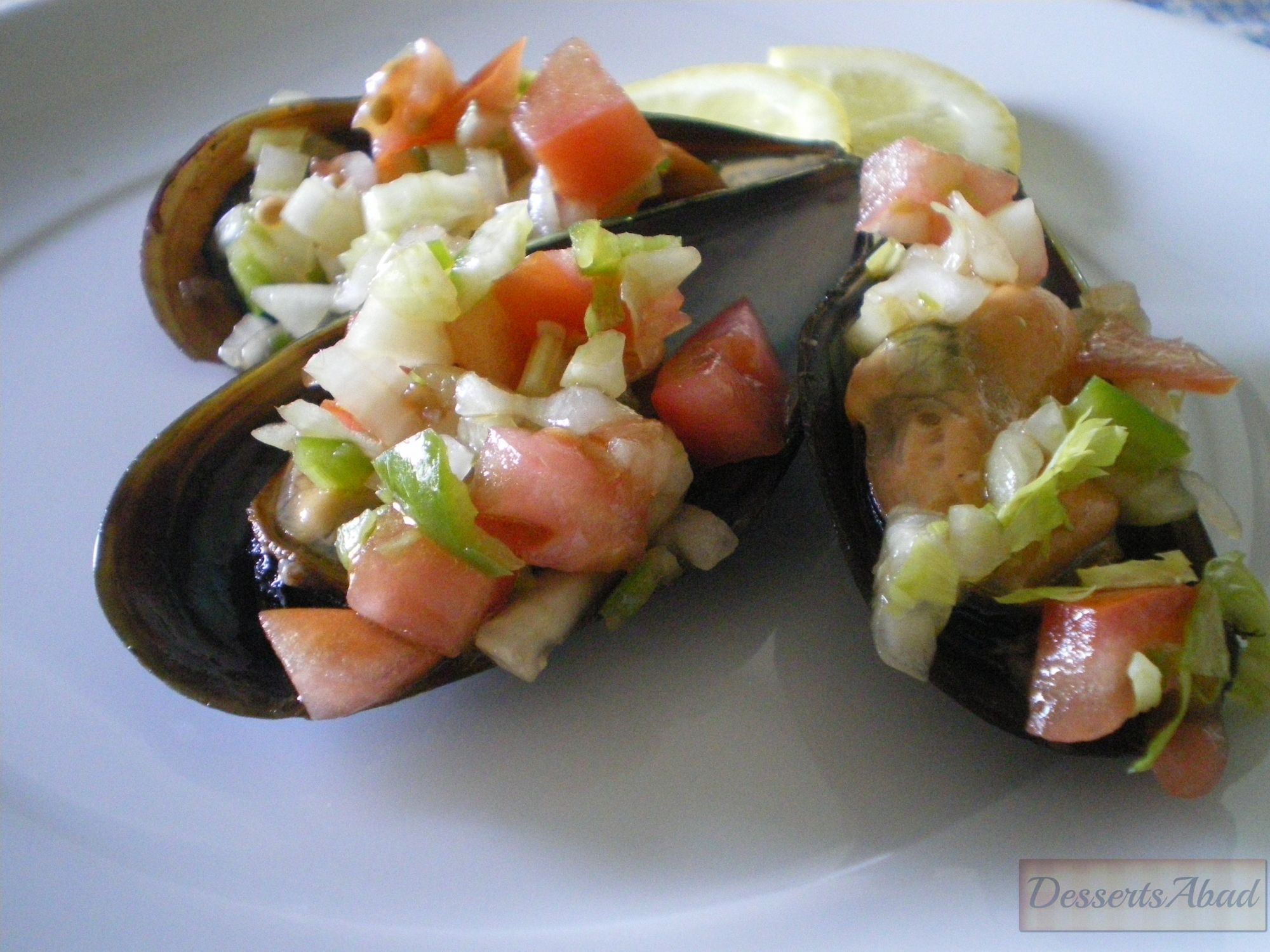 Picamos muy fino las verduras.Preparamos una vinagreta que añadimos a las verduras ya picadas y disponemos estas sobre los mejillones.Así de simple y sabroso.¡¡Buen provecho!!