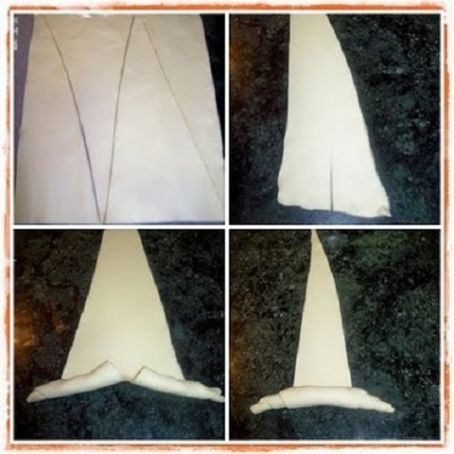 Abrimos la placa del hojaldre y estiramos, vamos haciendo corte en diagonal, tal y como veis en la foto. Al final, en la parte más ancha hacemos un pequeño corte en el hojaldre y vamos enroscando de abajo arriba, hasta llegar a la punta.