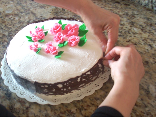 3º Colocar el plástico en la encimera y sobre él hacemos las formas que queramos que tenga nuestra rejilla (aquí la imaginación al poder), dejamos que se enfríe un poco como diez minutos y colocamos arededor de la tarta, sí, con el plástico, dejamos que se enfríe bien antes de retirarlo.