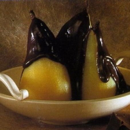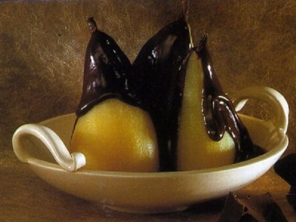 Trocear chocolate y fundirlo al baño maría, con la mantequilla y 1/2 vaso de agua, hasta obtener una salsa homogénea. Repartir parte de esta salsa sobre las peras. Servir el resto de salsa en salsera aparte.