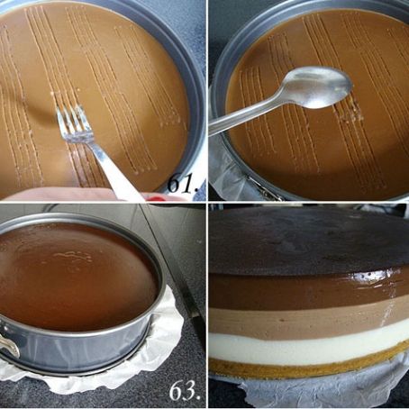 Ahora solo queda verter la capa en el molde sobre la galleta, hay que hacerlo con cuidado , no volcar directamente si no suavemente sobre una cuchara para que no rompa de golpe.Reservar mientras preparamos las otras capas.