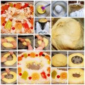 10. Pintar con huevo batido, muy suavemente, sin pinchar el roscón, y adornar con azúcar humedecido con unas gotas de agua y frutas confitadas.