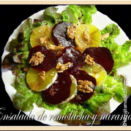 En un plato disponemos la lechuga, las rodajas de remolacha y las de naranja, Y añadimos unas nueces,