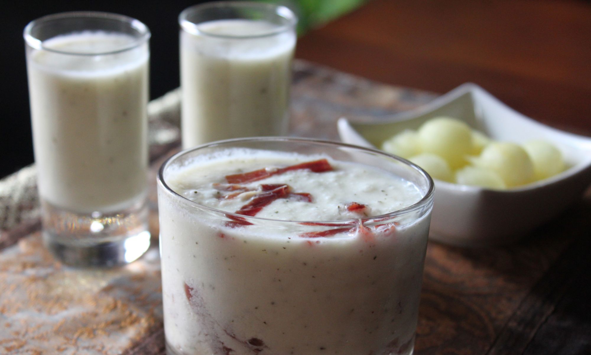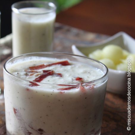 Antes de servirla, poner una cama de virutas de jamón ibérico y unas bolitas de melón. Espolvorear con un poco de hierbabuena y servir bien frío.