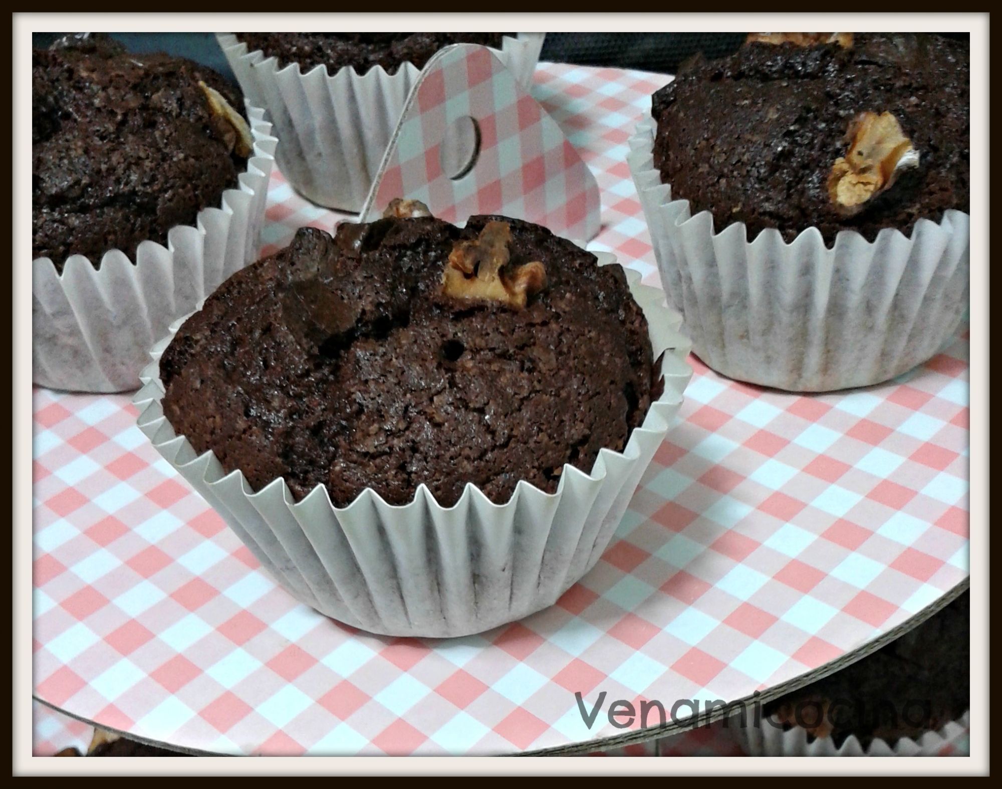 Rellenamos los moldes hasta los 2/3 de su capacidad, espolvoreamos con las nueces y el chocolate troceado en daditos. Horneamos a 180º C 20-25 minutos.