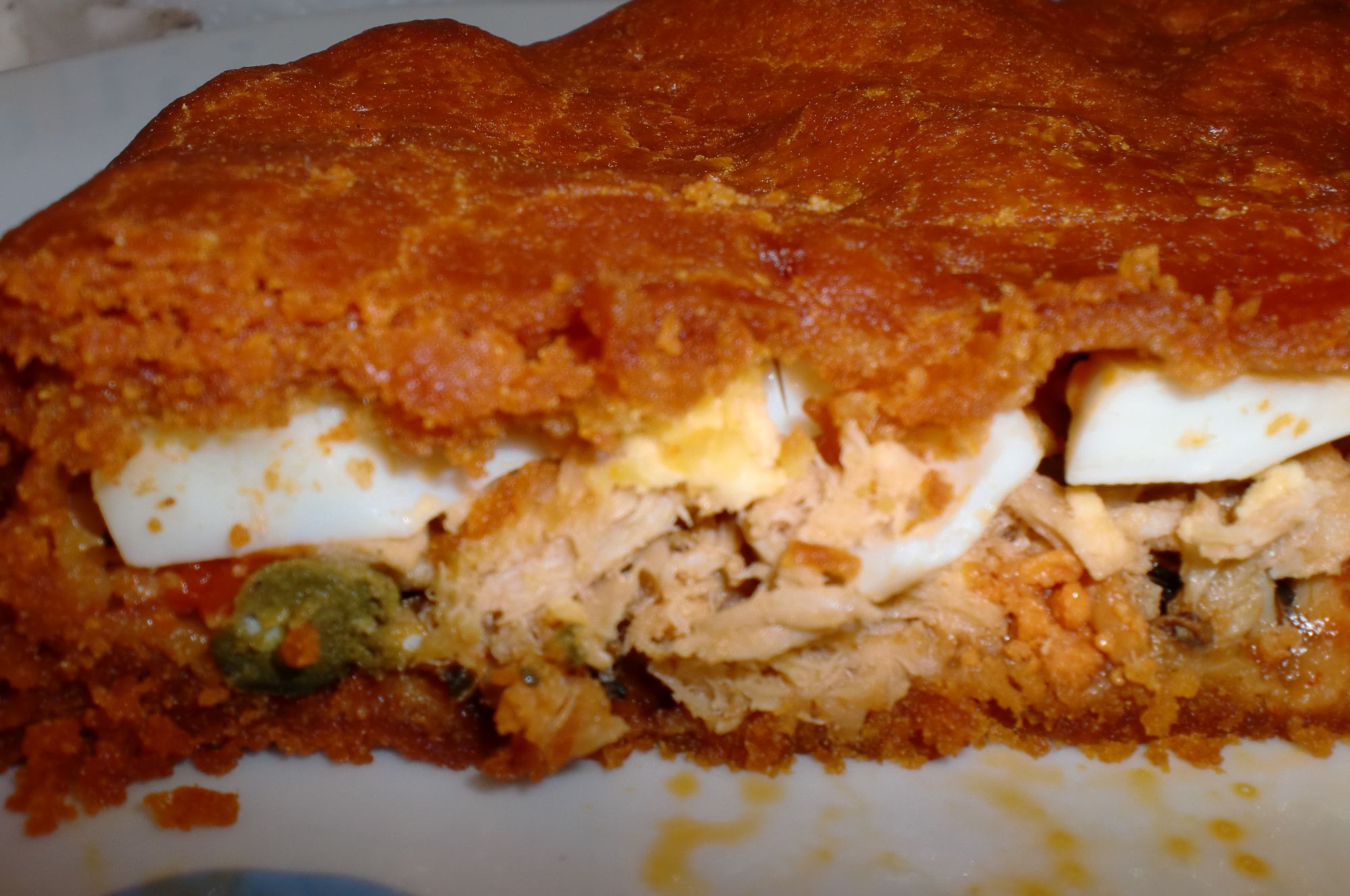 Después pondremos el atún bien escurrido y los huevos cortados en rodajas. Añadimos sobre esto un poco del escabeche de los mejillones.