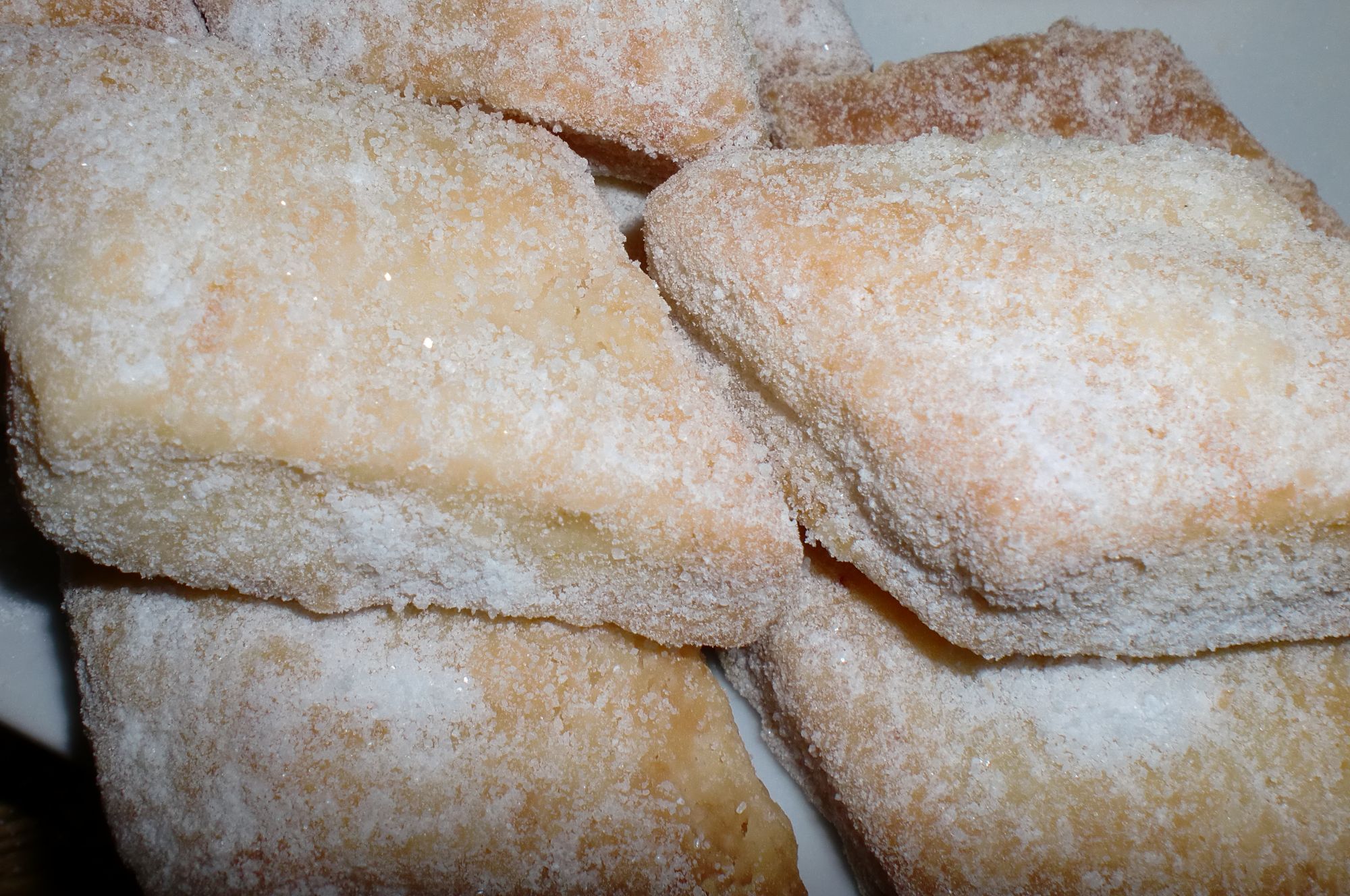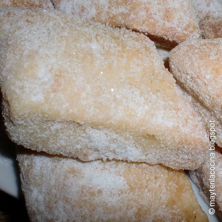 Deja la manteca de cerdo a temperatura ambiente, para que se ablande un poco. Mezcla con la harina, tamizada, el vino, el zumo de naranja, la ralladura de naranja, el agua de azahar y el azúcar en polvo, amasando brevemente hasta conseguir una masa lisa. En Thermomix puedes mezclar 10 seg a velocidad 5 y luego 1 minuto a velocidad espiga.