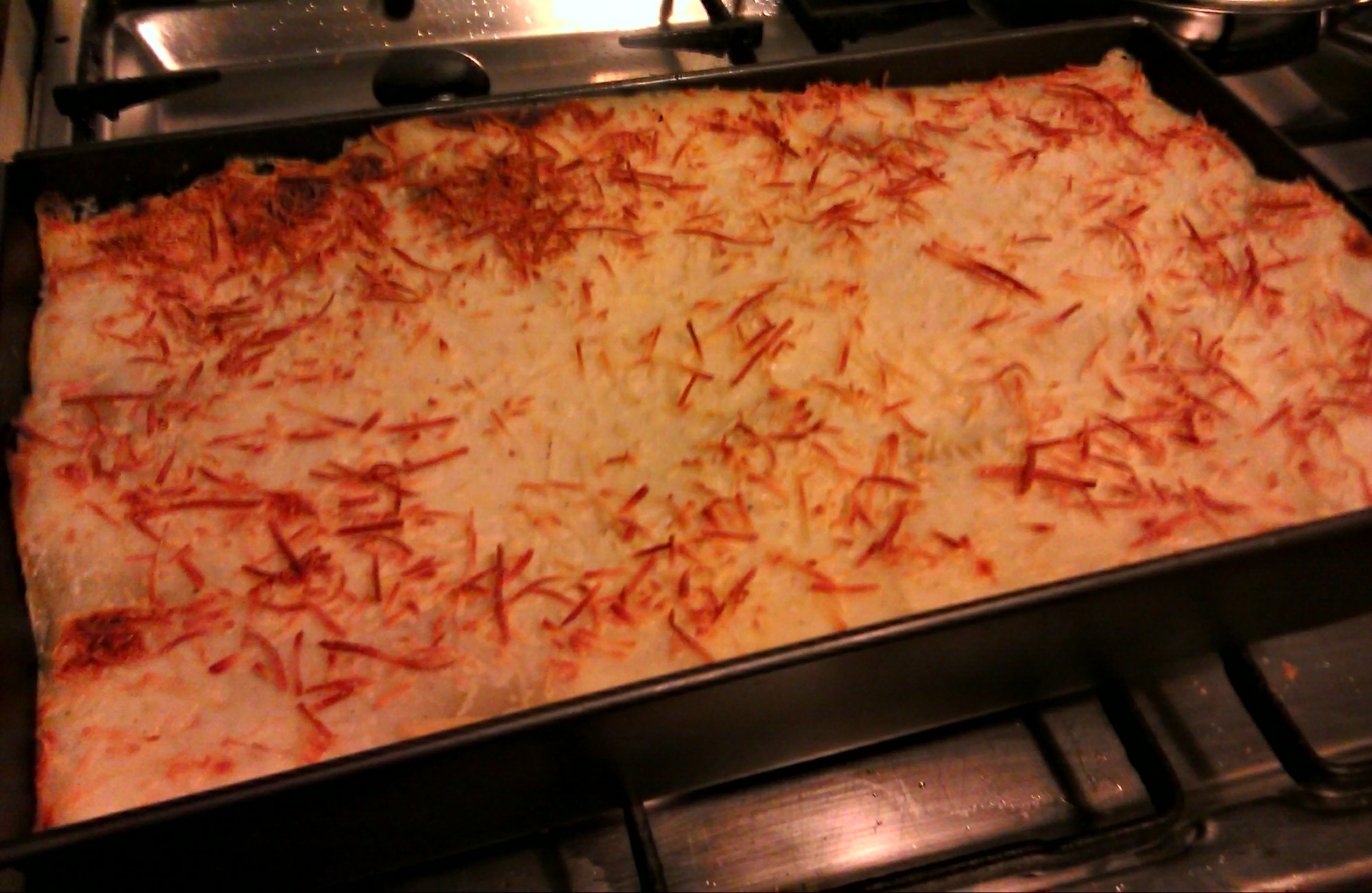 Ir alternando capas de pasta, bechamel y verduras, espolvorear con queso rallado y meter al horno hasta que se dore la superficie.