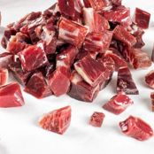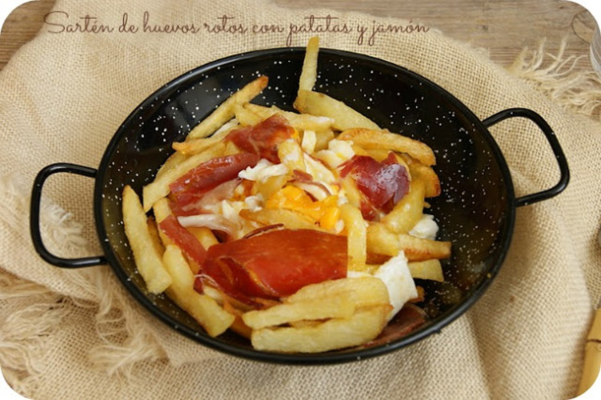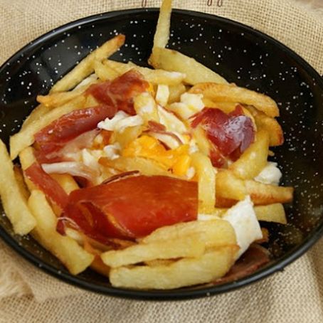 Colocamos el huevo encima de las patatas, y añadimos el jamón en tacos por encima.