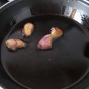 A continuación, en una sartén con abundante aceite de oliva, ponemos a freir los ajos enteros (antes debemos de hacerle un corte con el cuchillo para evitar que salten en el aceite).