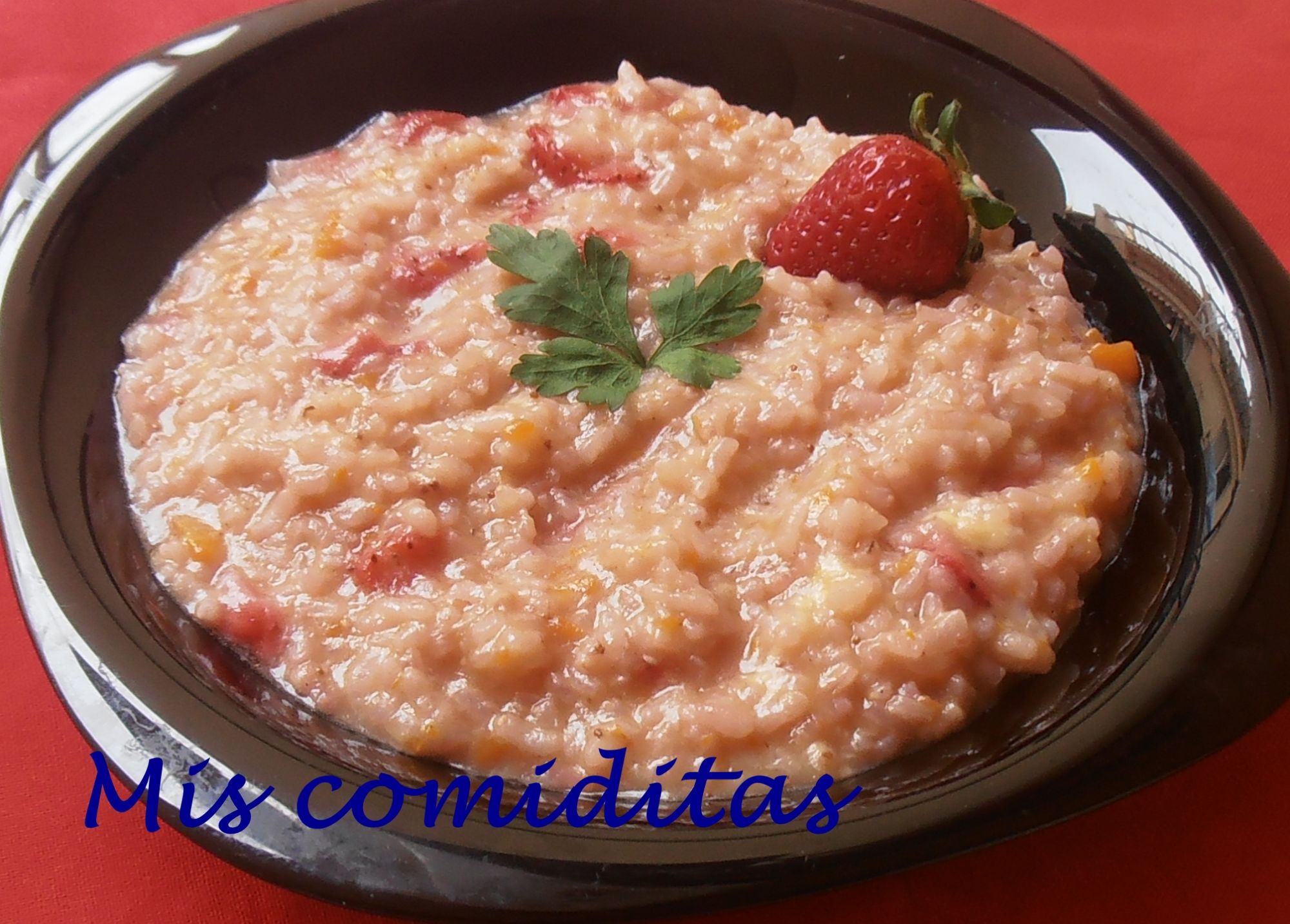 Cuando esté bien pochadita le incorporamos el arroz. Doramos un poco y le añadimos las fresas troceadas reservando cinco o seis para el final.