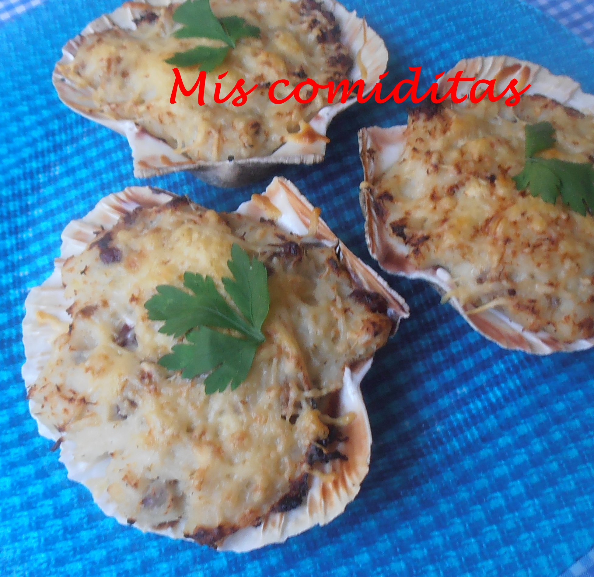 Rellenamos las conchas (o el "molde" que queramos usar) y espolvoreamos con abundante queso rallado.