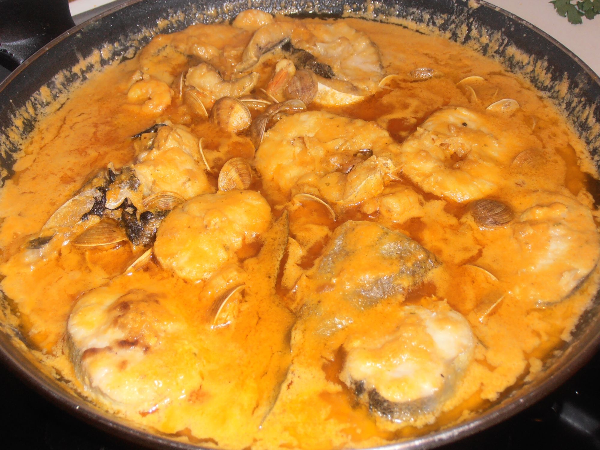 Pasados un par de minutos se le añade el majado de almendras, el tomate frito,los granos de pimienta, el azafrán y el fumet hasta cubrir.