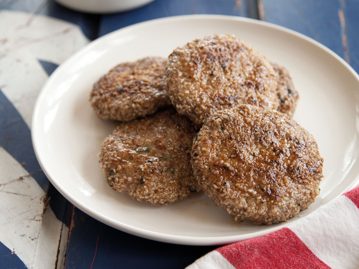 Seguido hacemos bolas de carne, las aplastamos y las rebozamos en semillas de sésamo. Las cocinamos a la plancha con un poquito de aceite. Emplatamos y servimos.