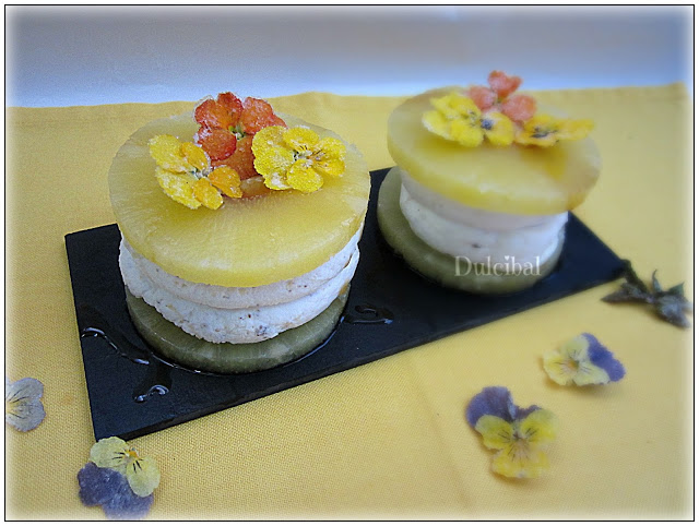 - Poner una rodaja de piña, sobre ésta, poner dos círculos de crema y cerrar con otra rodaja de piña.