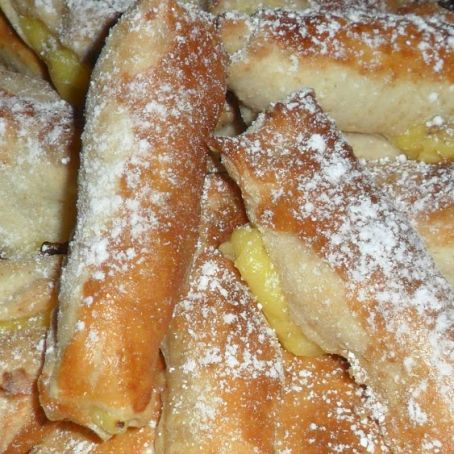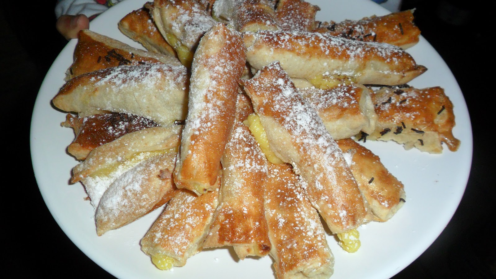 Se trabaja muy bien la masa con todos los ingredientes. Se extiende hasta que está muy fina y se corta en tiras que se enrollan a las cañas dando dos o tres vueltas. Se presiona el extremo con un tenedor para que no se separe y se fríe en aceite abundante.