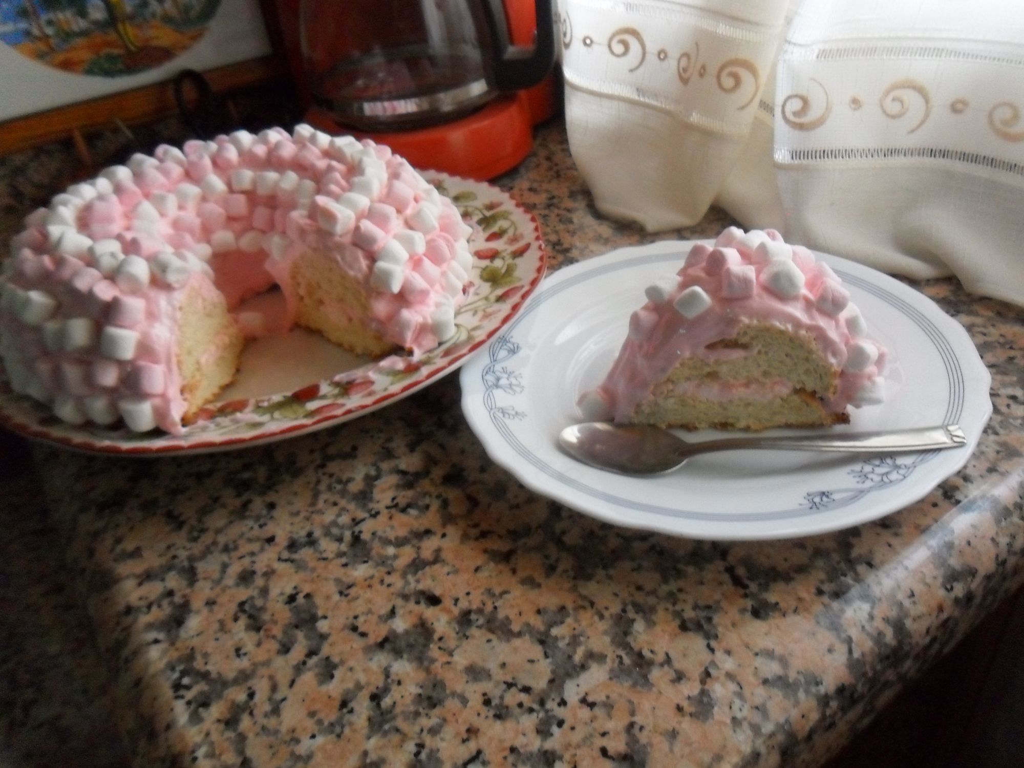 Tanto la decoracion como el relleno los idee yo misma con muchas gominolas de nubes, el resultado fue curioso y delicioso, ademas que intente reducir el azucar lo masimo posible por el dulzor de la propia golosina