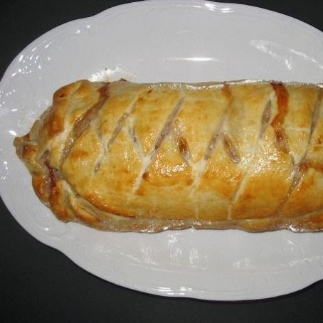 Saca la carne del frigo y ponla sobre una base de hojaldre previamente estirada (calcula que sobre por los lados para sellarlo con la parte de arriba). Añade la cebollita con el jamón por encima y una capa de queso. Cierra también por arriba con otra capa de hojaldre. Píntalo con huevo y mételo al horno a 180º durante unos 30 minutos.