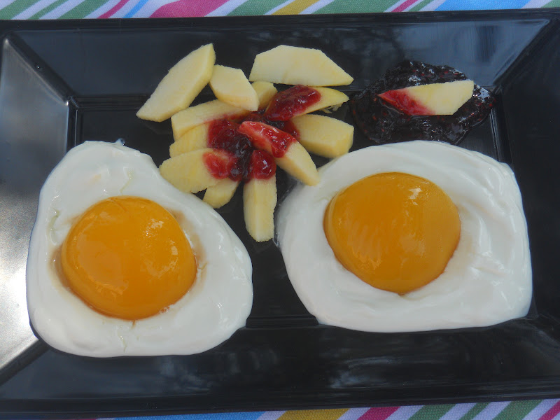 A un lado del plato volcamos una cantidad de yogur griego (imitando la clara del huevo), espolvoreamos con azúcar blanca (imitando la sal) , y encima media rodaja de melocotón en almíbar (seria la yema).