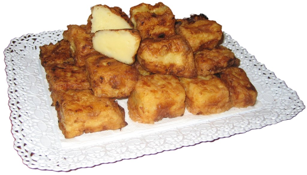 Pasa la masa a una fuente amplia y baja y deja que se enfríe. Cuando este fría, corta en rectángulos, reboza con harina y huevo y fríelos en una sartén con aceite. Escurre sobre un plato con papel de cocina absorbente.