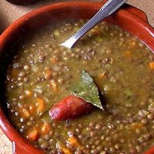 Cuando las lentejas están tiernas y las patatas, se echa un majado de ajo frito y carne de ñora hidratada y se deja hervir 5 minutos más