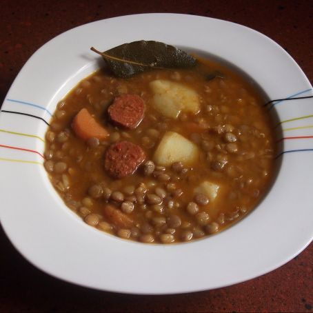 Cuando lleve 7 u 8 minutos y empiezan las lentejas a perder su dureza, se agrega el sofrito anterior, el tomate frito, las patatas, las judías verdes, la calabaza y el chorizo. Se cuece durante otros 7 - 8 minutos más.