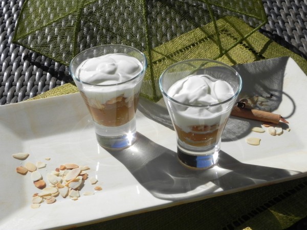 Primero la manzana, a continuación las almendras, y por último el yogurt frío.
