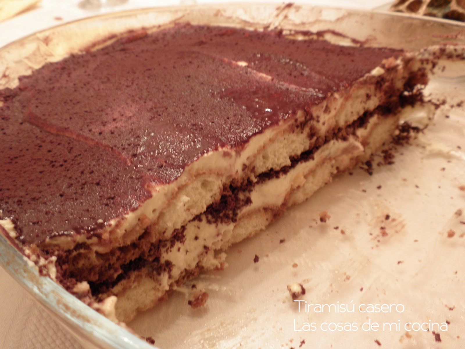.Ahora solo falta espolvorear con el cacao puro en polvo para darle el toque final al postre. Reservamos en el frigorífico ya que este postre hay que consumirlo tras pasar unas horas en frio. Lo habitual como hemos hecho aqui es hacerlo el día anterior y sacarlo unos 10 minutos antes de servirlo en la mesa.