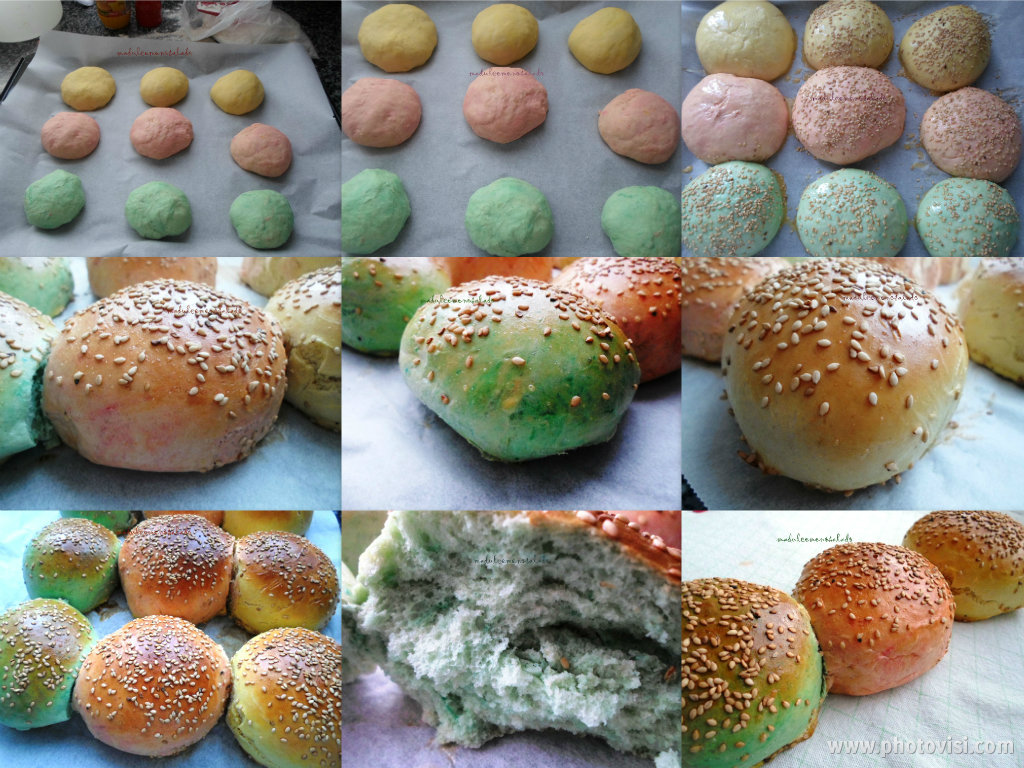 Bueno ya tenemos las tres masas y cada una de un color , pues ahora a hacer los panecillos y dejarlos fermentar, para que fuera mas rápido calenté el horno a 50º y apague, coloque dentro la bandeja con los panecillos y la tape con papel vegetal, estuvieron aprox. unos 20 minutos hasta que doblaron el volumen.