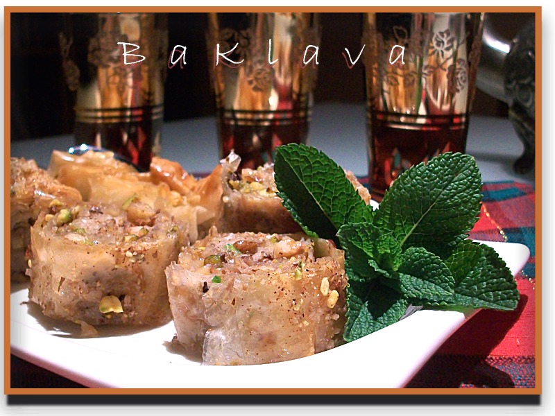 2- Sobre la mesa donde vamos a trabajar extendemos la primera capa de pasta filo y con una brocha de cocina la pintamos con mantequilla derretida (sin pasarnos). Cada dos o tres capas le ponemos el relleno que consiste en nueces y pistachos picados mezclados con un poco de azúcar y canela en polvo. Seguimos poniendo capas, a gusto.