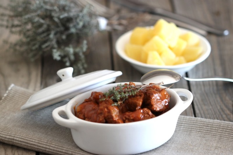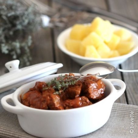 Ponemos una cocotte al fuego con la manteca de cerdo, cuando esta se derrita, añadimos la carne y la marcamos por todos los lados, retiramos la carne a un plato y en la misma cocotte pochamos la cebolla, a continuación añadimos el ajo pelado y aplastado, el tomate pelado y sin pepitas cortado en cuartos, lo dejamos cocer durante diez minutos, añadimos la carne y las hierbas arómáticas, lo cubrimos con caldo de carne caliente, tapamos y dejamos cocer a fuego lento aproximadamente 2 horas removiendo a menudo.