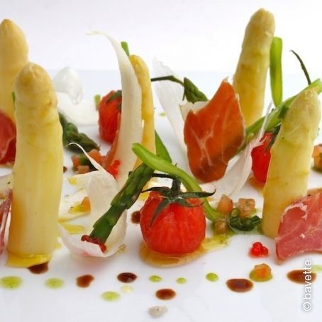 Nos quedamos solo con las puntas de los espárragos, los blancos y los trigueros, y las colocamos de pie en una fuente de servir. Colocamos también las virutas de espárrago que tenemos reservadas, la judía verde cortada en láminas, los tomate cherry enteros, el jamón ibérico, las huevas de salmón, añadimos unas gotas de vinagre de Módena, sal de especies y por último aliñamos con la vinagreta que tenemos reservada.