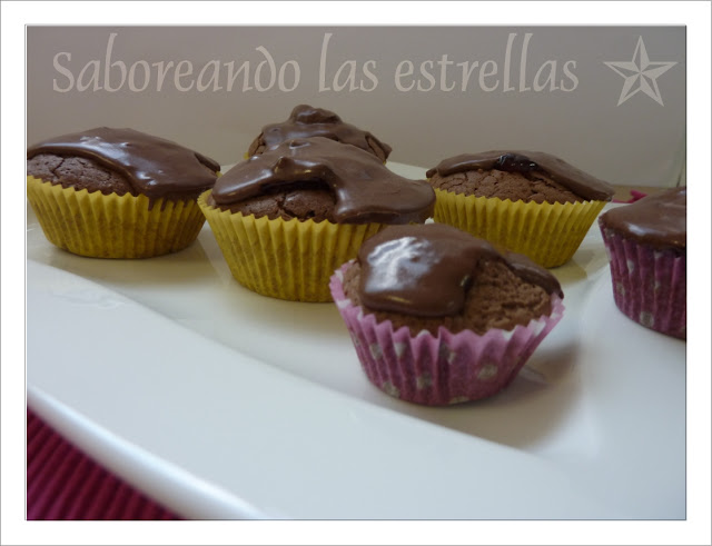 Si forma picos se los cortamos y ponemos sobre cada magdalena una cucharadita de mermelada y lo cubrimos con la glasa de chocolate. ¡Bon apetit!
