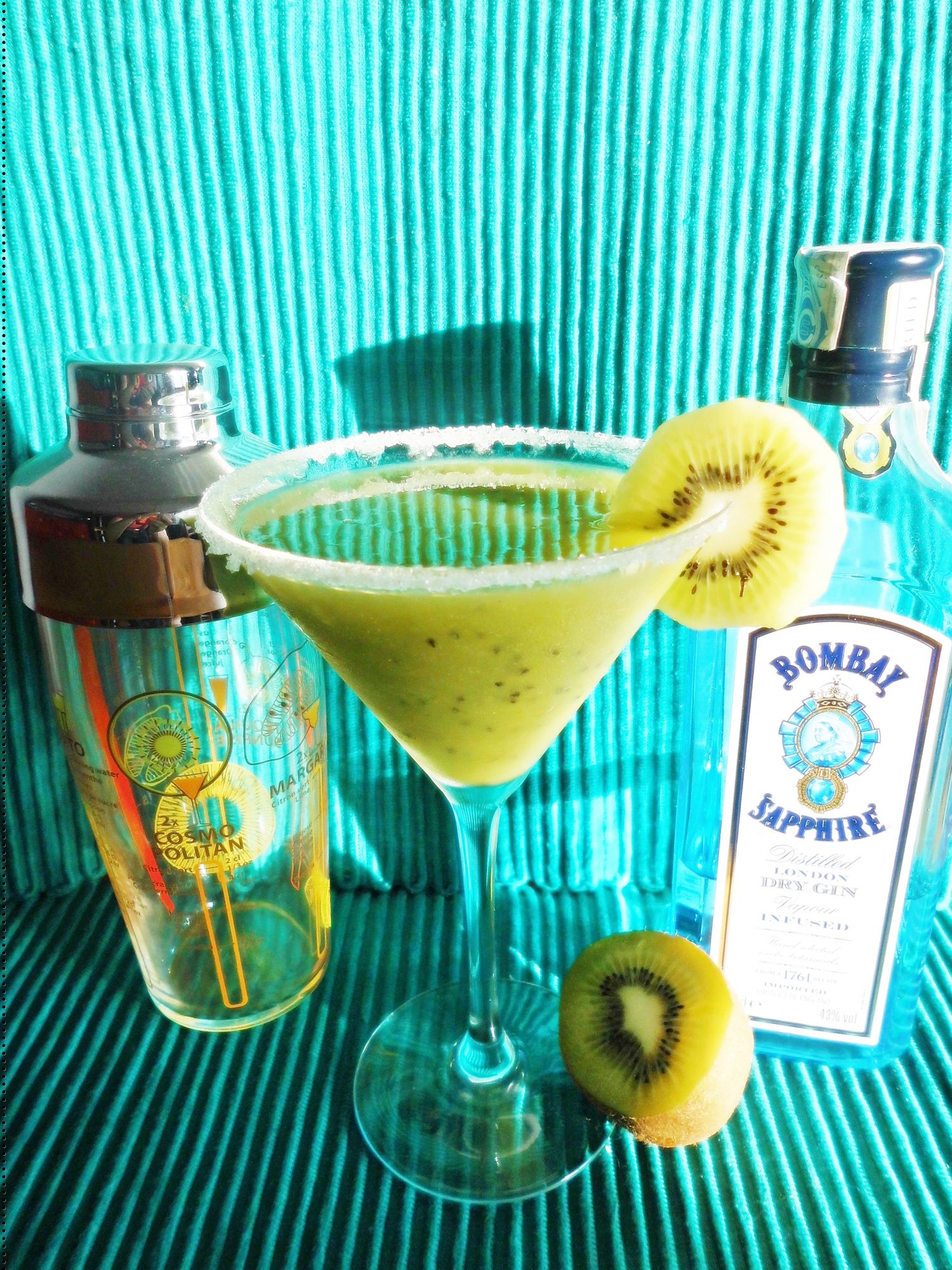 - ginebra, 3 kiwis, zumo de naranja y licor de curaçao azul