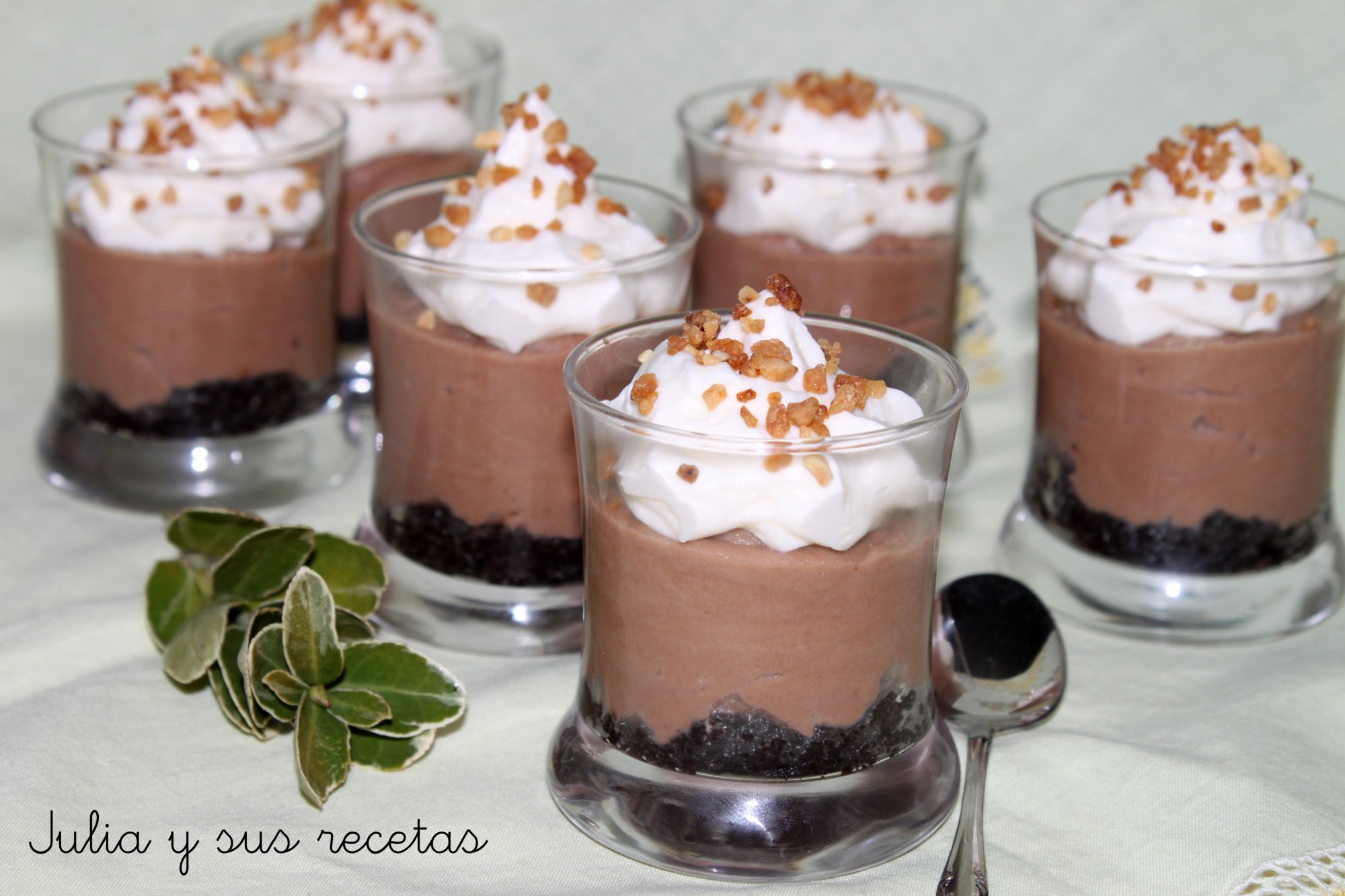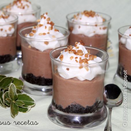 Trituramos las galletas oreo en la picadora con su crema. Derretimos un poquito la mantequilla y se la añadimos, mezclamos bien y ponemos un poquito en cada vasito.