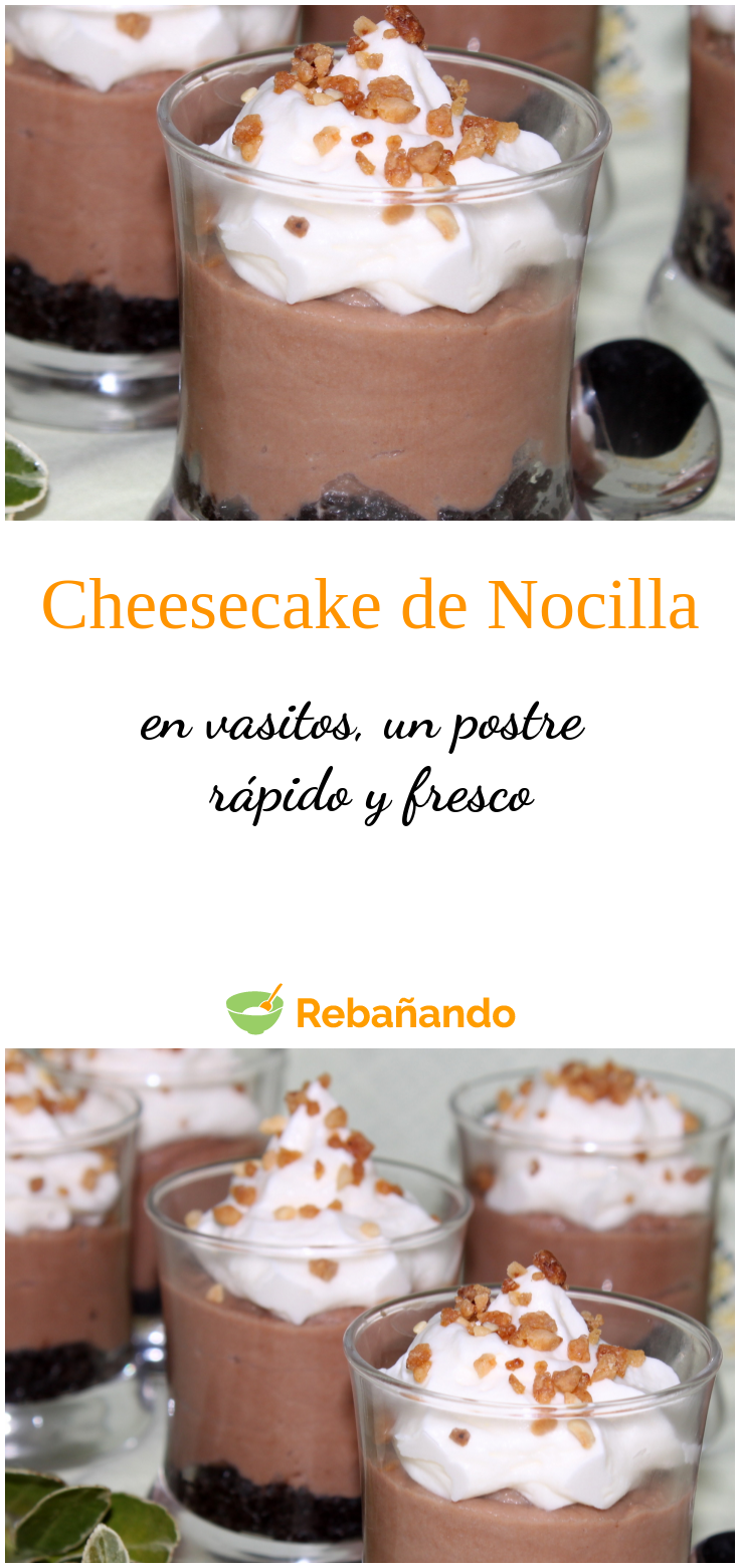 Ponemos la crema de queso y Nocilla en una manga pastelera y vamos llenando los vasitos sin llegar al final.
