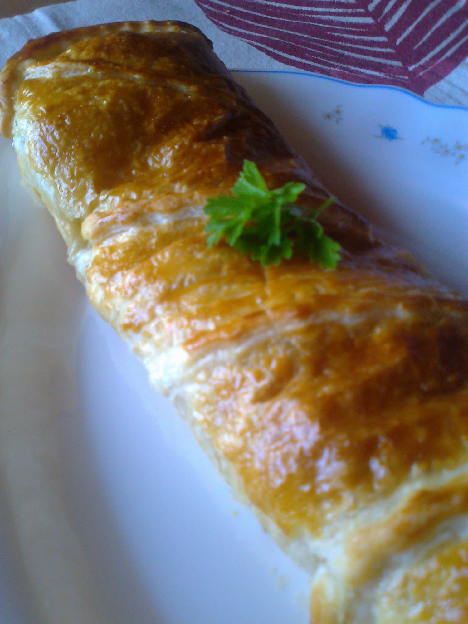 Estirar el hojaldre y cubrir el solomillo, cerrandolo bien