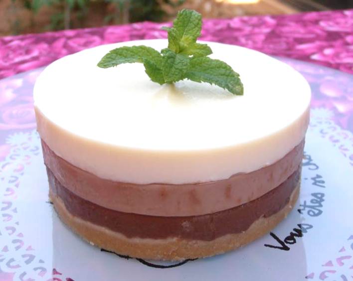 Para la primera capa de chocolate negro ponemos a cocer en una cazuela 250 ml de leche, 250 ml de nata y los 150 g de chocolate negro troceado. Previamente habremos deshecho un sobre de cuajada en los 250 ml de leche. Remover hasta que la mezcla hierva y volcar sobre la galleta con cuidado. Repetir la misma operación con el chocolate con leche y por último con el chocolate blanco.