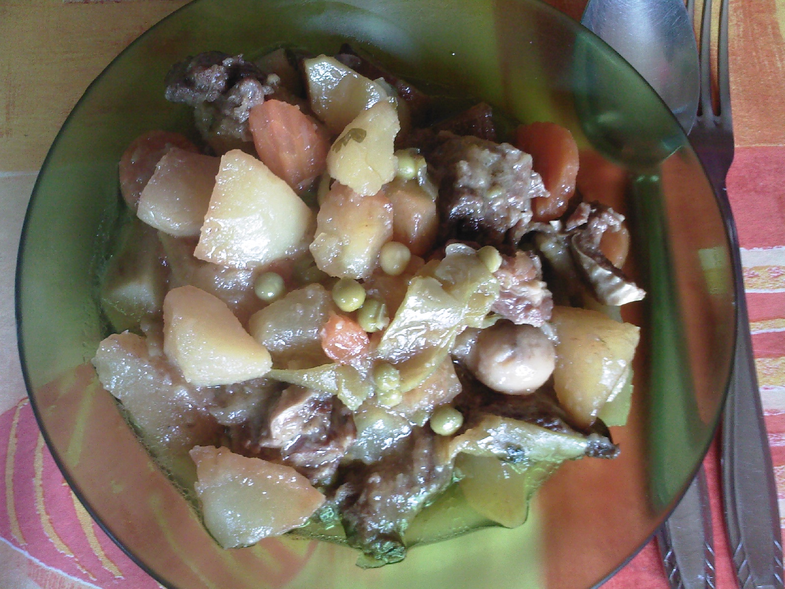 Añadir a la cazuela donde tenemos reservado la costilla la verdura y las patatas fritas.Mezclar todo bien.