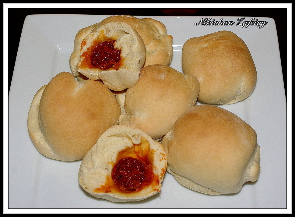 Estira la masa no mucho haciendo rectángulos, poner un trozo de chistorra y envolver cerrando bien los extremos, barnizar con huevo batido.