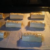 Enrollar sobre sí mismo cada porción de hojaldre, sellando la junta con un pelín de agua para que no se abran.