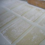 Disponer el hojaldre sobre un poco de harina y con un cuchillo o cortapastas, dividirla en 8 rectángulos iguales.