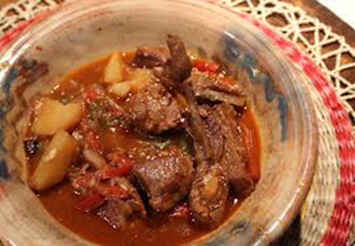 Lo anteriormente reservado vamos a machacarlo bien y se le añade un vasito de vino blanco y toda esta mezcla la agregaremos al caldero de cabrito junto con una pizca de sal. El caldero lo tendremos cociendo a fuego moderado unos minutos y después bajarle el fuego y dejar nuevamente hasta que la carne esté tierna.