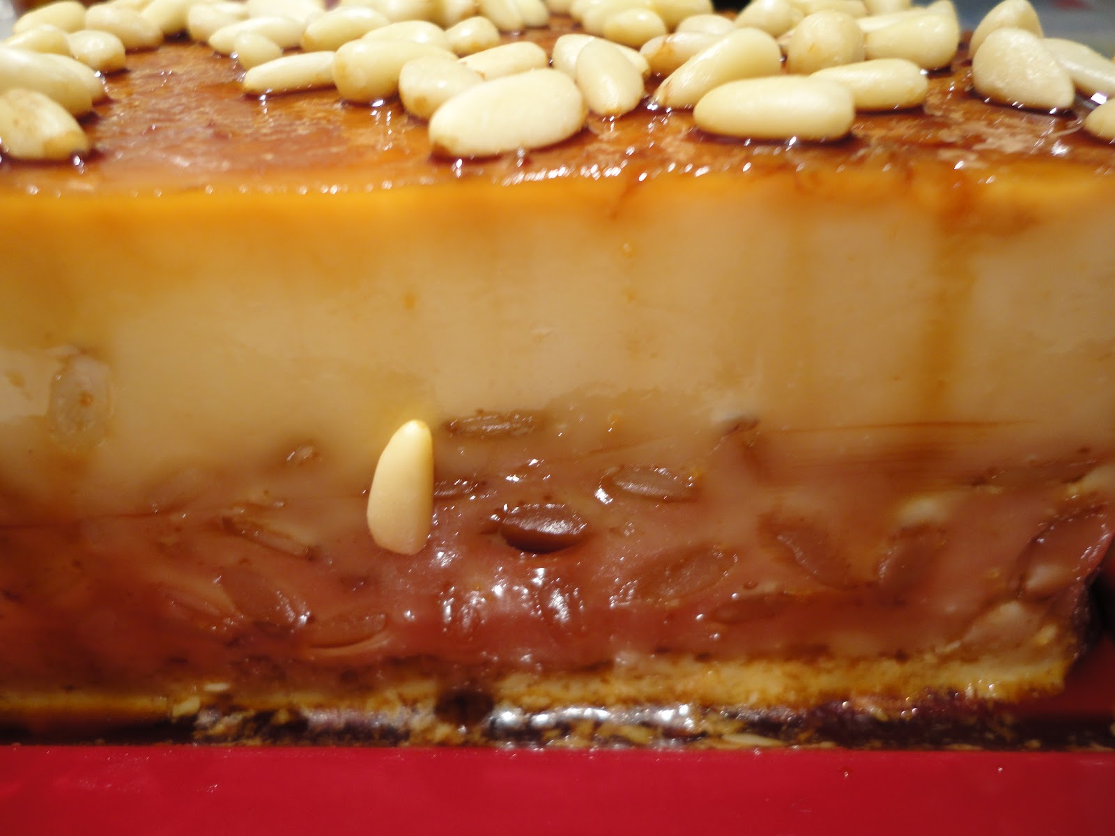 En un molde ponemos caramelo líquido y los piñones.