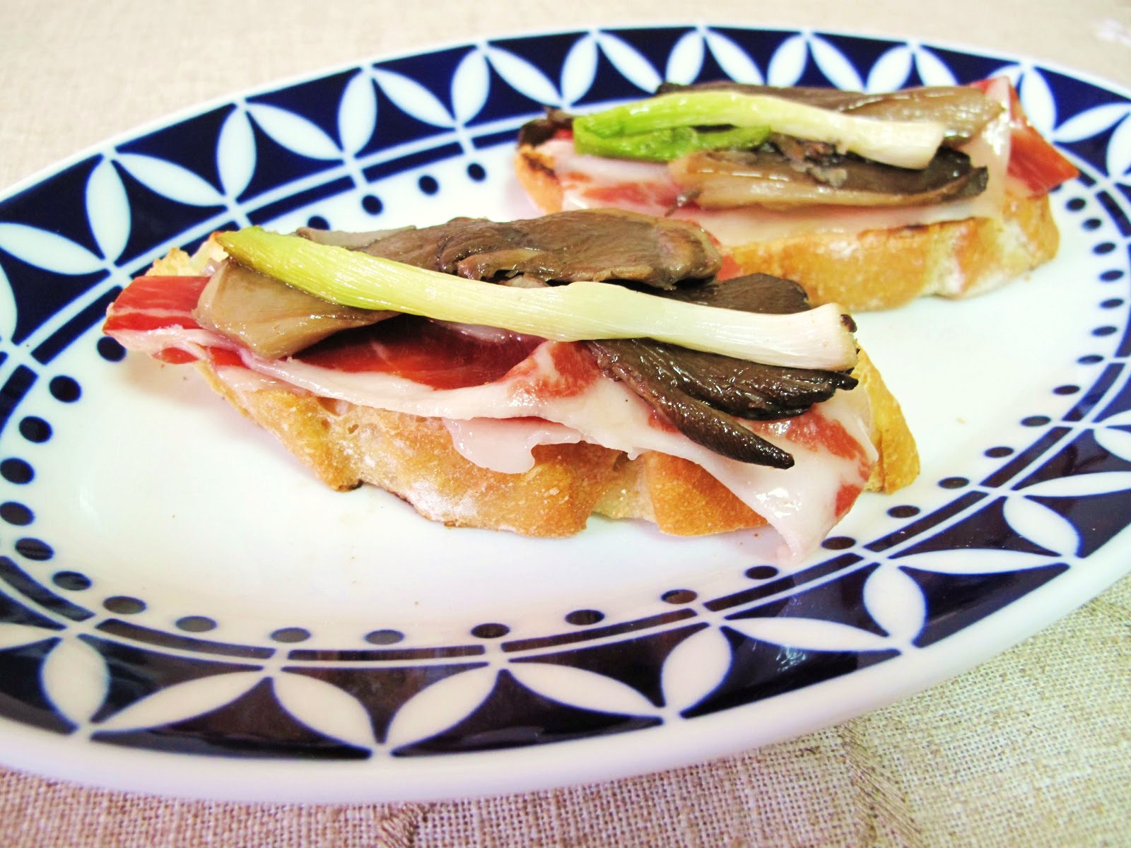 Sobre las rebanadas de pan poner una loncha de jamón, unos trozos de setas y ajos tiernos.