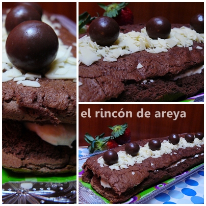 Cortar el bizcocho en dos láminas (mejor romperlo con las manos para que tenga un corte más bonito), sobre una lámina (la más grande de las dos) ponemos la mousse de chocolate blanco y ponemos la otra lámina por encima