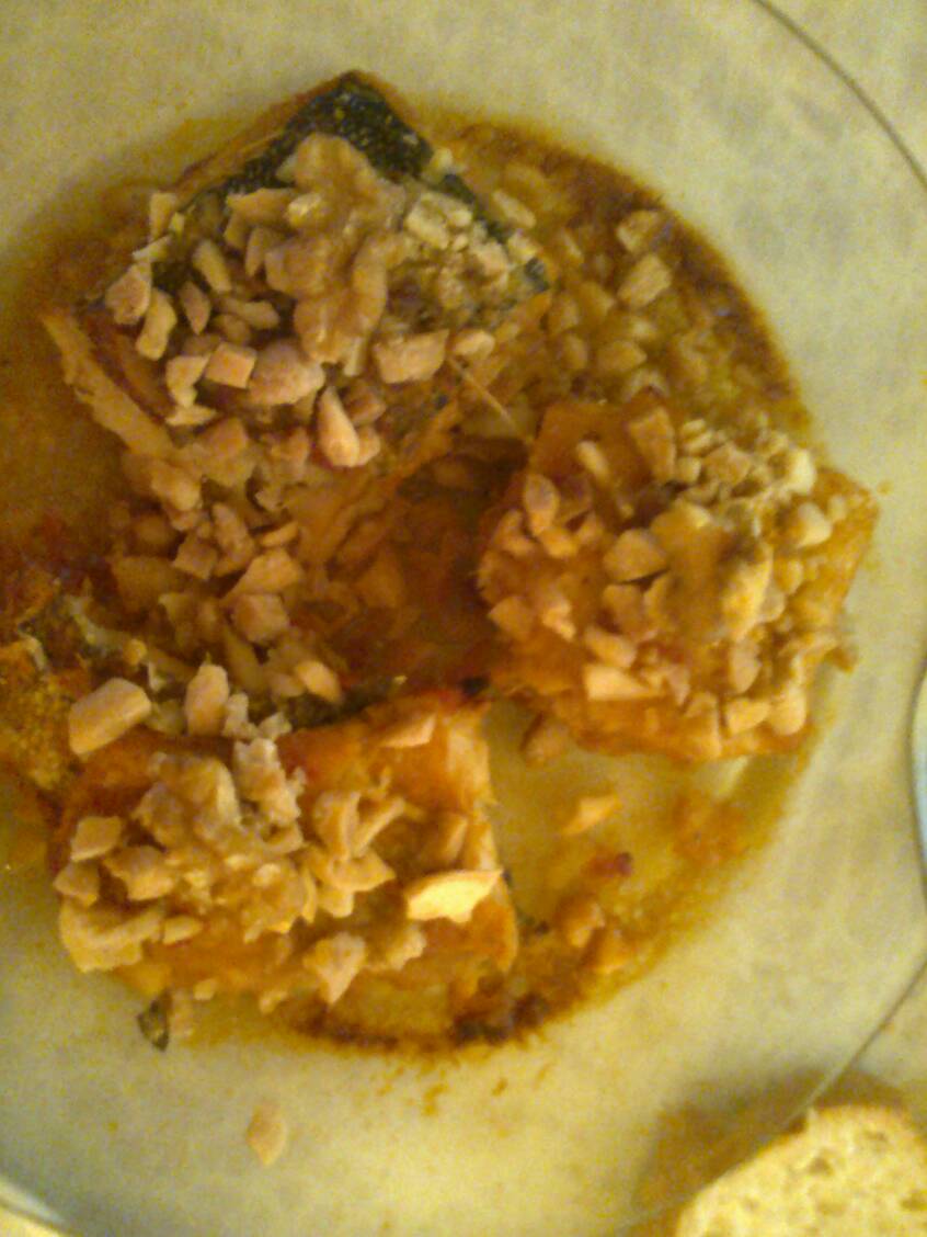 - bacalao, almendras, tomate, cebolla y harina y vino blanco
