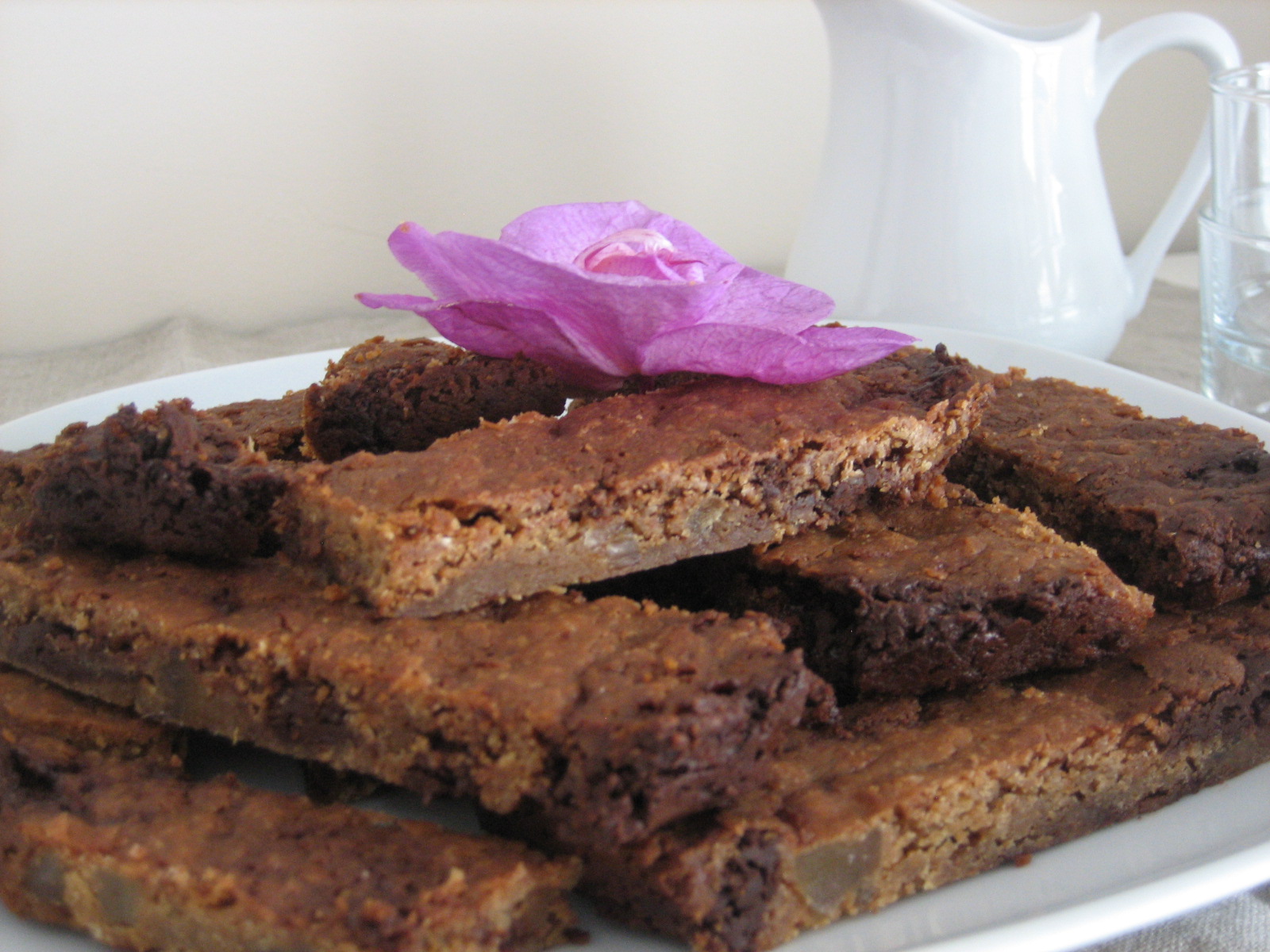 Vertemos la masa en un molde rectangular untando con mantequilla. Si queréis podéis poner papel de horno pegado en la base y horneamos 20 minutos a 180 ºC con el horno precalentado. Comprobamos que está cocido, en este caso al revés que con el resto, debe tener aspecto de seco por fuera, pero si introducimos un palillo debe salir con masa.